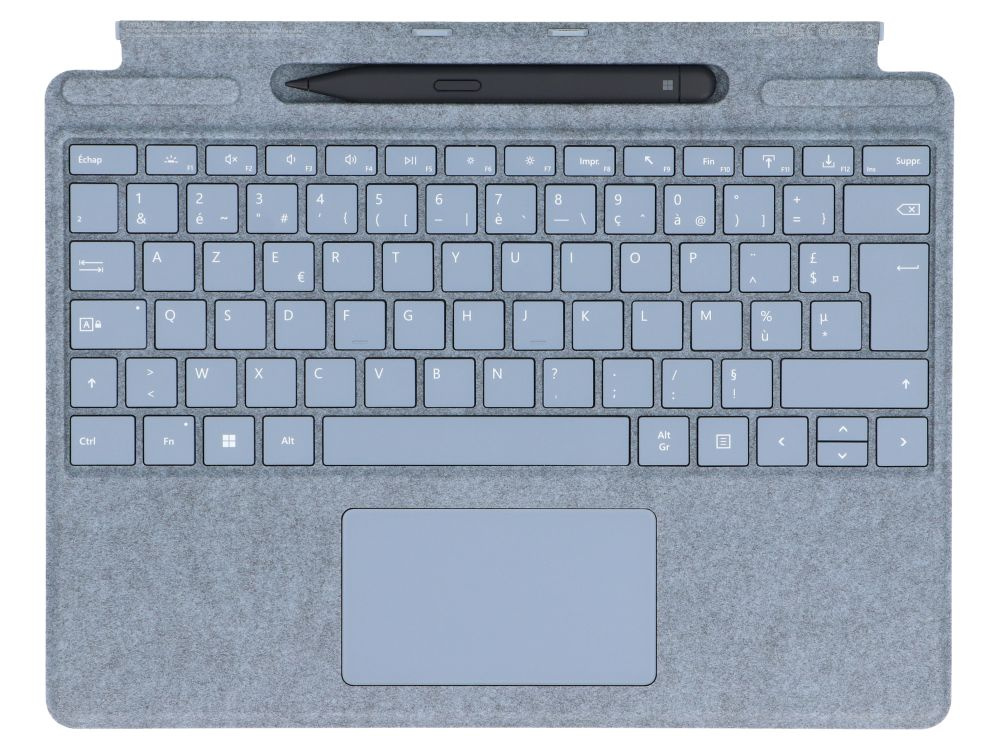 • Klawiatura Microsoft Surface Pro Signature Keyboard (Ice Blue), produkt po zwrocie, opakowanie otwarte. Smukła i lekka, z układem AZERTY – idealna do pracy mobilnej i codziennego użytkowania.